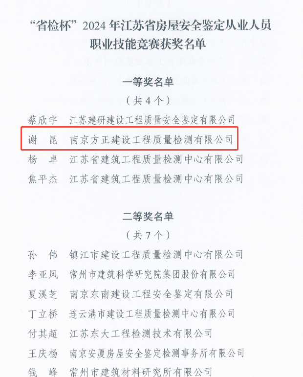 喜報(bào)!我單位謝昆同志獲得2024年 江蘇省房屋安全鑒定從業(yè)人員職業(yè)技能競賽個(gè)人賽一等獎(jiǎng)!